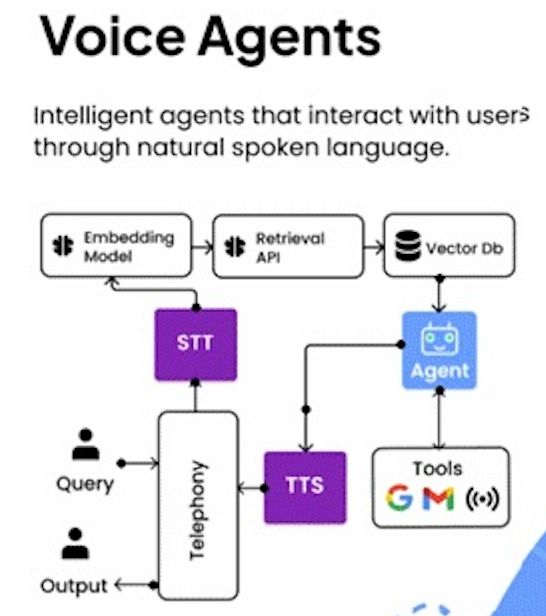依托嵌入模型与语音转换技术(STT/TTS),语音智能体实现自然语言双向交互,包含STT(语音转文字)、TTS(文字转语音)、Agent 核心模块与向量数据库,可连接 Google Search 等工具,展现从“听见”到“行动”的闭环。