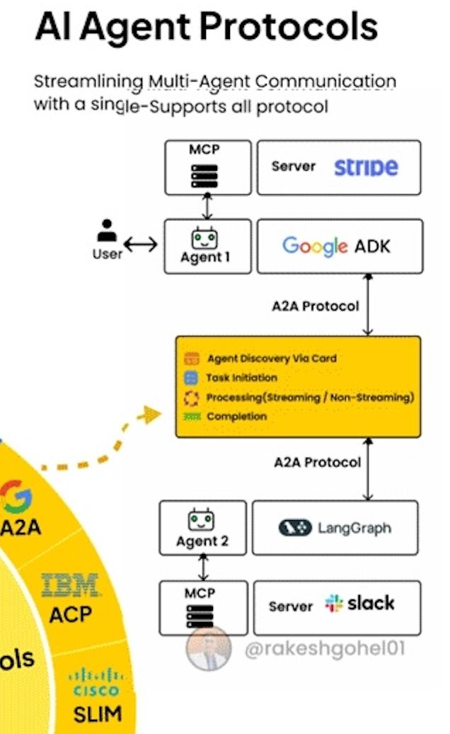 2025年智能体生态的关键突破在于协议标准化,相当于多智能体协作的 “TCP/IP”,让不同厂商、不同功能的 Agent 能跨系统通信。目前主流协议包括 A2A(Agent-to-Agent)、MCP(模型上下文协议),以及 Google ADK、LangGraph 等生态专属协议。