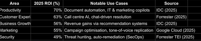 Google Cloud 对 3466 位企业高管的调研显示,智能体已脱离 “试点阶段” ,成为企业降本增效的核心抓手。88%早期采用者实现正向ROI,39%企业部署超10个生产级智能体。投资回报率最高的五大领域是: