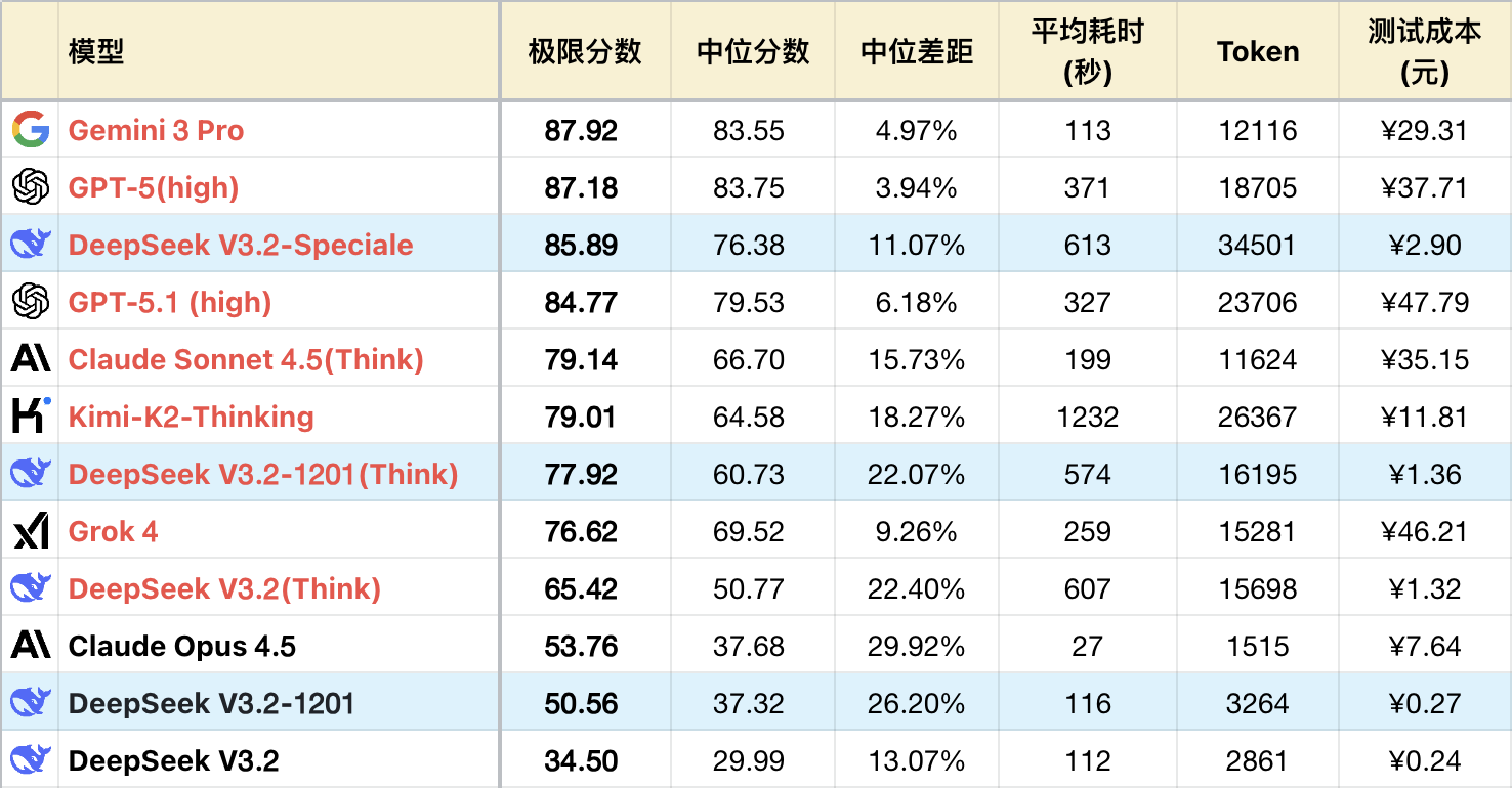 而作为One-More-Thing的Speciale版本,能力冲进之前被北美四家牢牢占据的大本营,考虑测试误差范围,能力与GPT-5(high)相当,与DeepSeek自己公布的测试成绩相吻合。