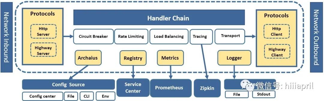 不同协议请求进入到对应的Server,Server将具体的协议请求转换为Invocation统一抽象模型,并传入Handler chain,由于handler根据统一模型Invocation进行处理,不必每个协议开发出来都自己开发一套治理。处理链可通过配置更新,再进入Transport handler,使用目标微服务的协议客户端传输到目标。