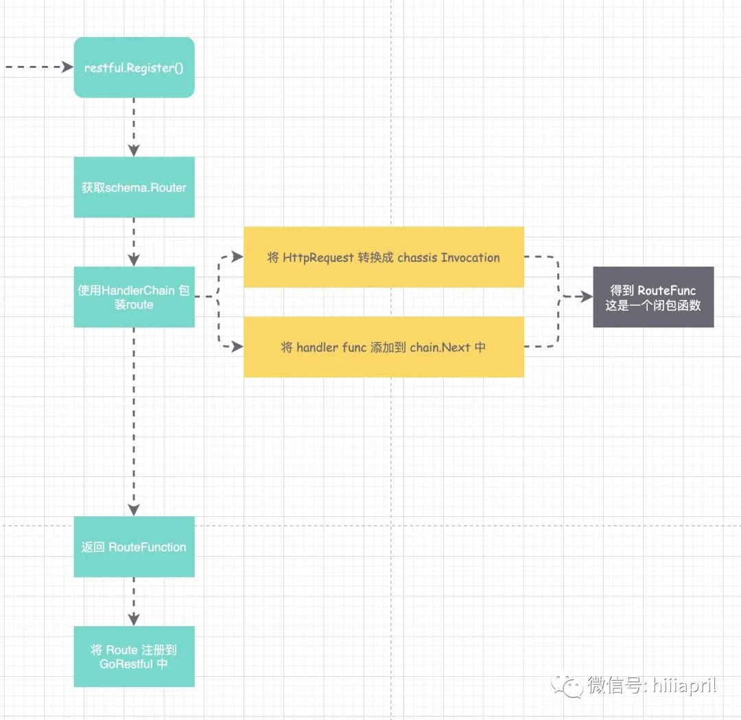 最后会把使用 WrapHandlerChain 封装后的handler 注册到go-restful 框架中。