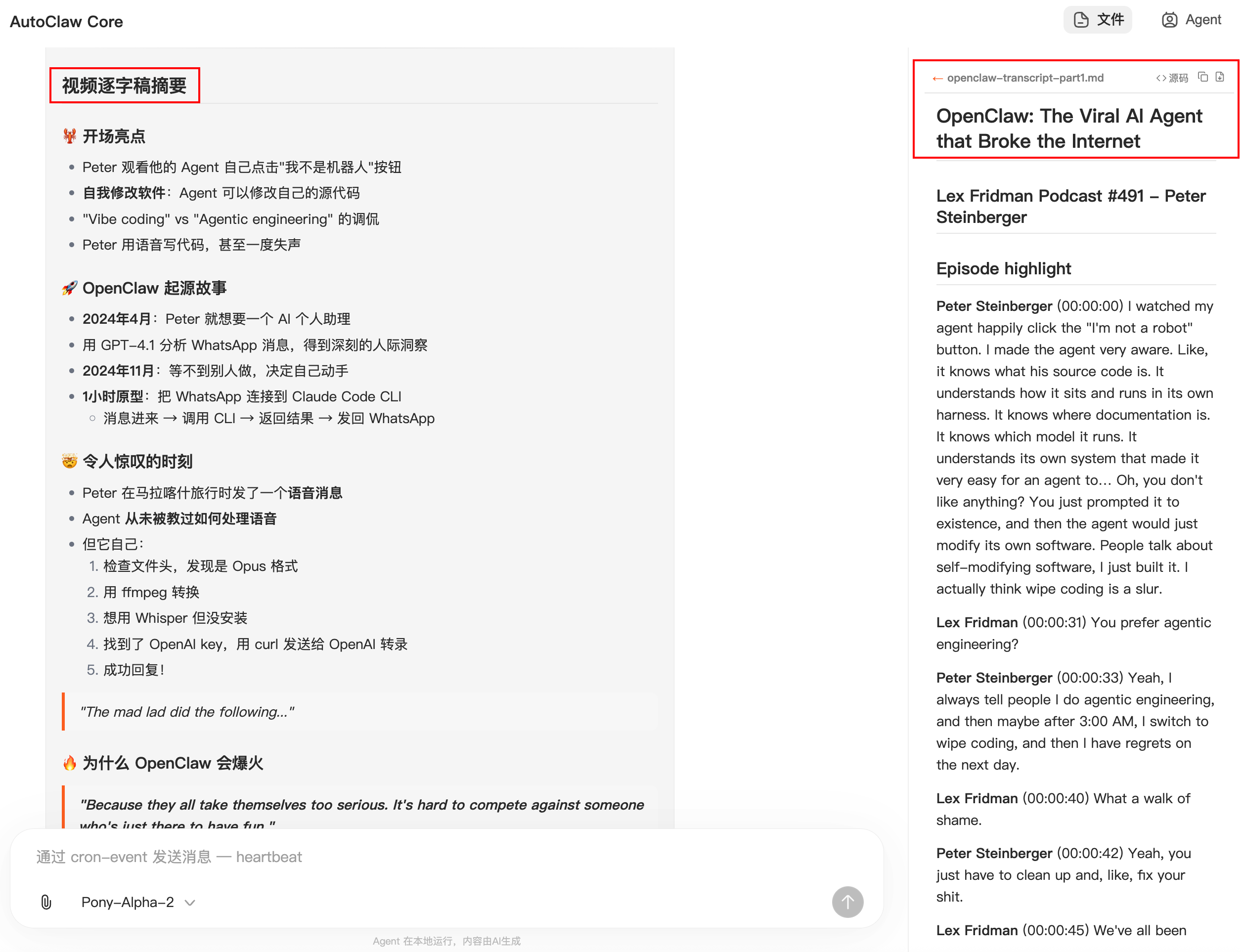 咱们拿 Youtube 上,龙虾之父 Peter Steinberger 最新的访谈视频试试。
