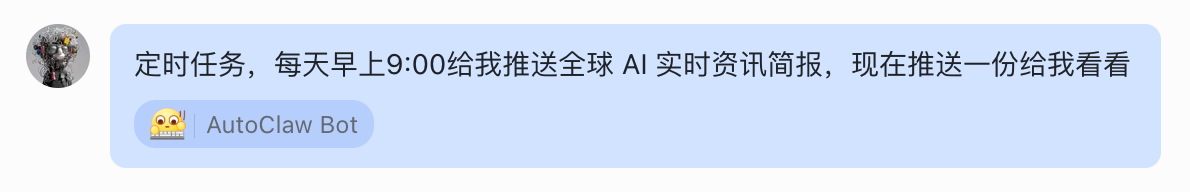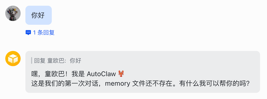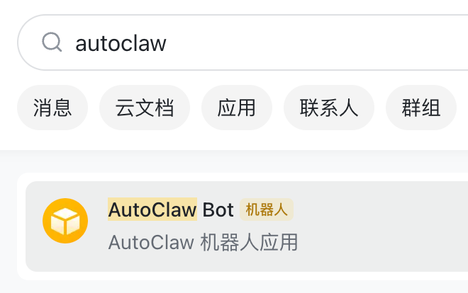 在飞书里面,你就能搜索到 AutoClaw,跟他通过飞书聊天了。