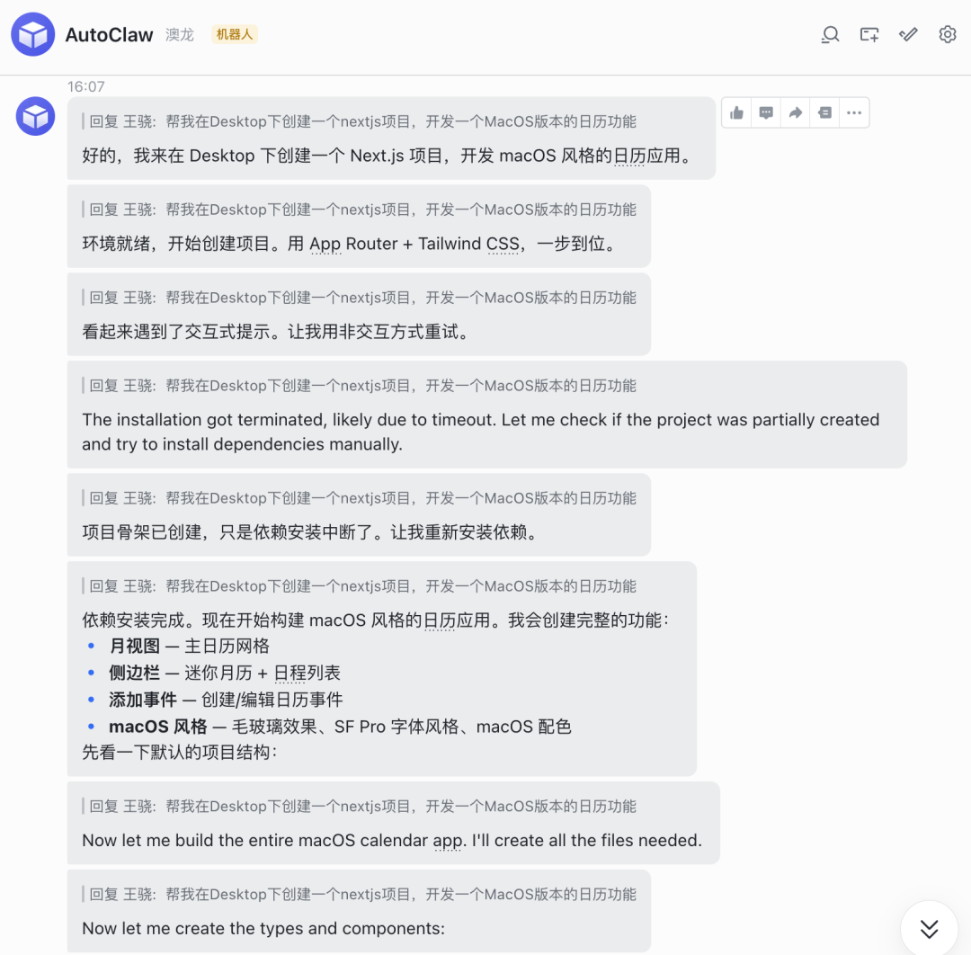 比如直接在飞书对话框里让它写一个MacOS日历App: