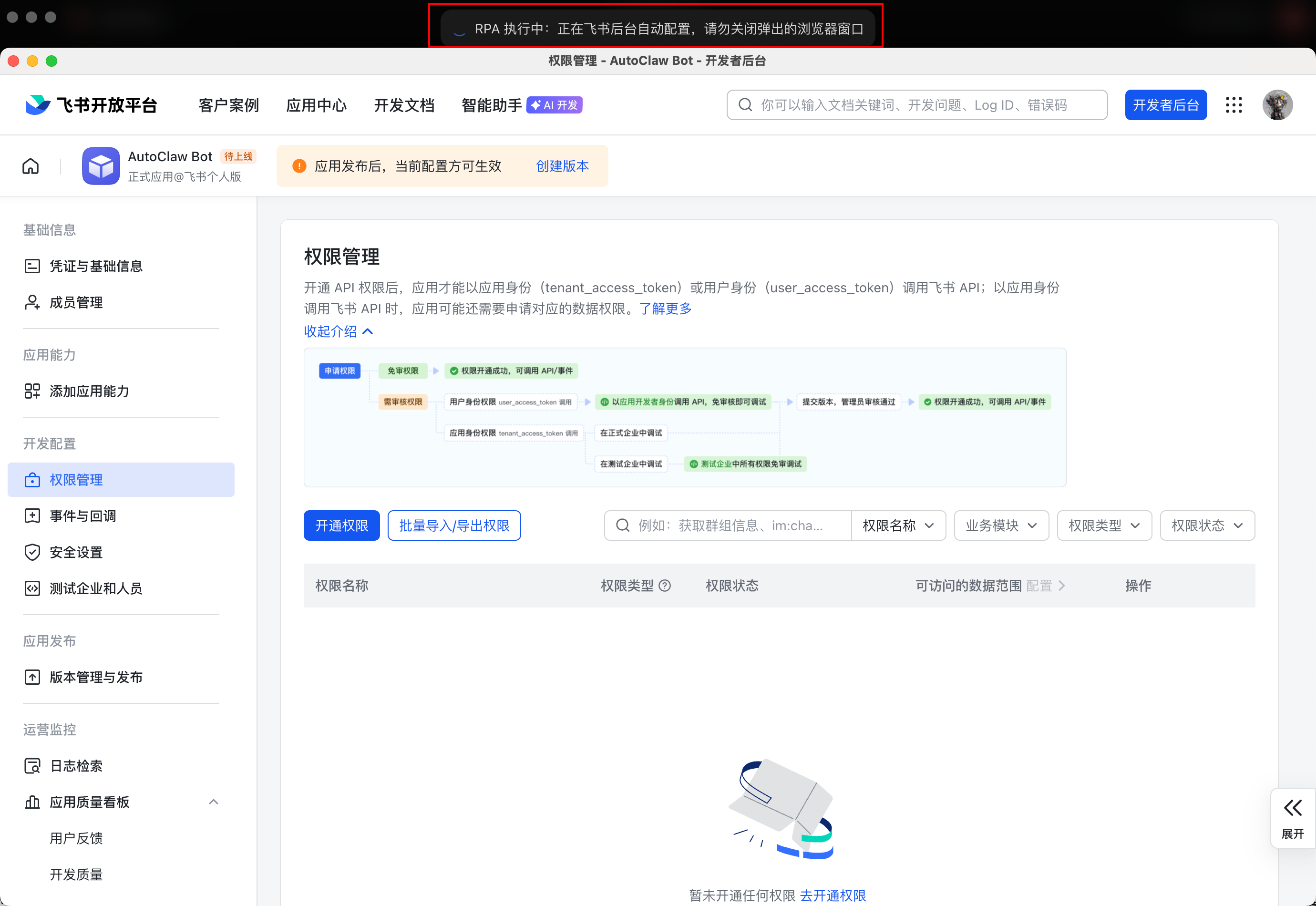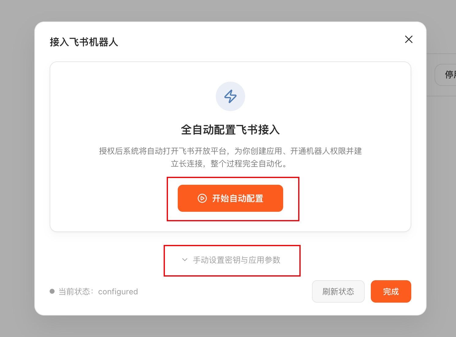 点「开始自动配置」,系统自动打开飞书开放平台、自动创建应用、自动开通权限、自动建立连接。全程无人值守。