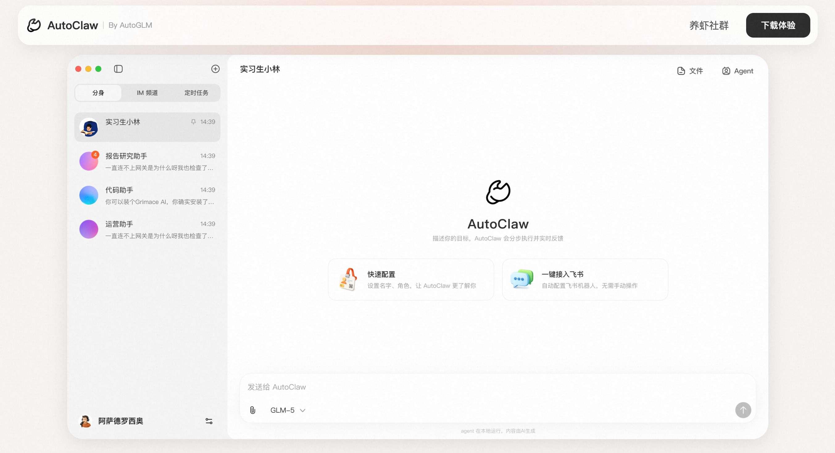 下载一个App,选一个模型,点一下飞书,开始干活。