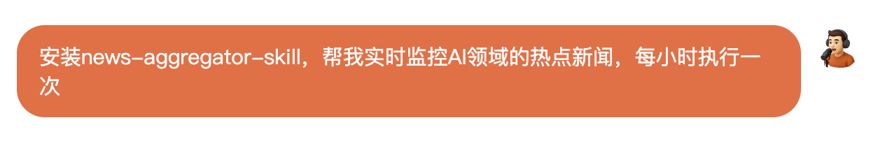 让他安装 news-aggregator-skill,帮我监控 AI 领域的热点新闻,每小时执行一次。