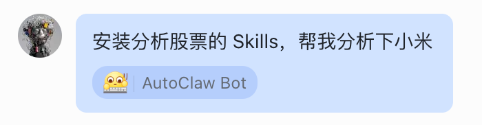 比如,我让他安装一个分析股票的 Skills,然后分析下小米。