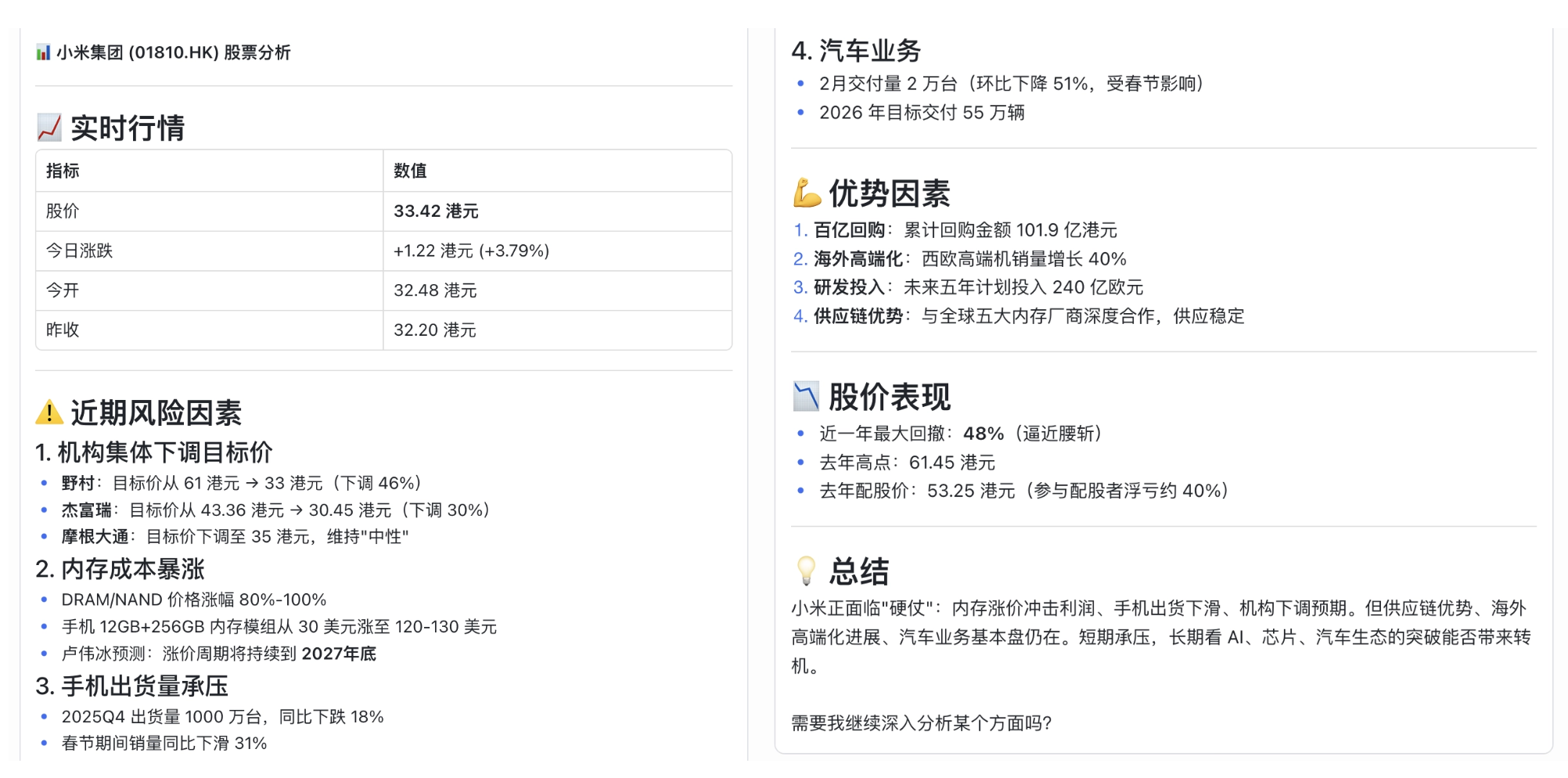 分析的很全面,包括实时行情,风险因素,优势因素,股价表现和总结。