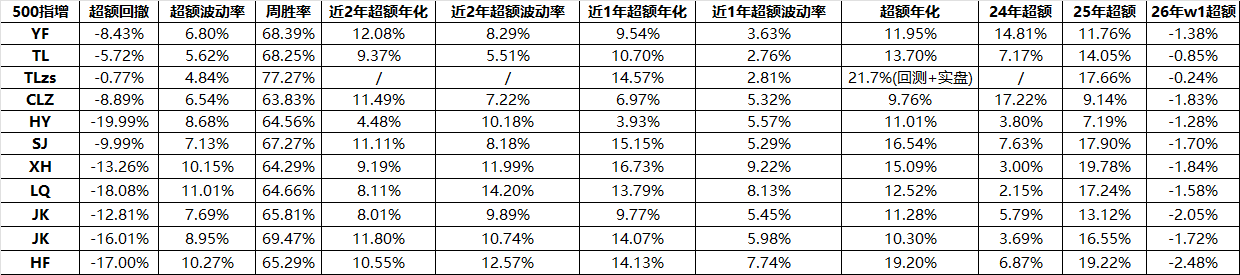 500里面除去第三行需要按情况讨论的,可以看出有些管理人超额波动和超额回撤非常大,但是在量化大年25年相对超额收益也比较高,这种相对来说还算不错的情况。至于一些超额波动率啥的又大,超额年化还差不多甚至更低的就emmmm。