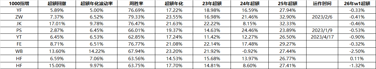 24年和25年这两年是一个挺不错的观察窗口,24年有过两次普遍的超额危机,25年又是一个超额大年。结合最大超额回撤,超额波动率,周胜率以及超额收益可以看出一些情况。
