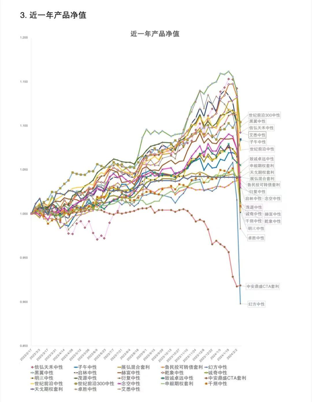 这张图可能有一些老哥有印象。讲的就是24年1月底2月初那次因为基差管理导致的小微盘流动性危机的时候各家中性产品的表现。幻方的一根长线是不是亮瞎了狗眼,事实上,幻方当年中性策略年收益普遍在-5%到-6%。所以,大家可以大概get一下他们为啥砍了中性策略。