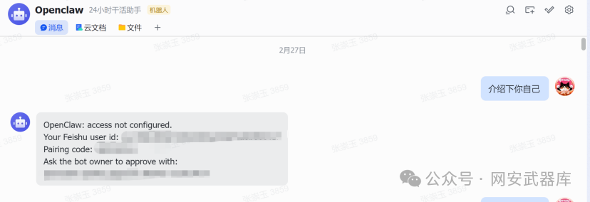 在飞书应用中向你的机器人发送任意消息(比如 “介绍下你自己”),机器人会回复一个 Pairing Code(配对码)