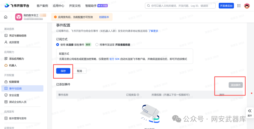 事件配置方式:选择“使用长连接接收事件”(推荐)