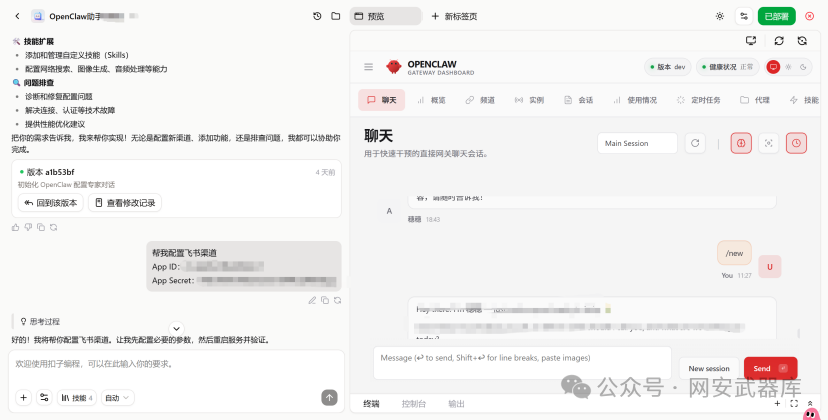 回到扣子平台部署好的OpenClaw管理界面,需要进行飞书插件的配置。只需要告诉它:帮我配置飞书渠道,App ID是什么,App Secret是什么。然后等待即可。