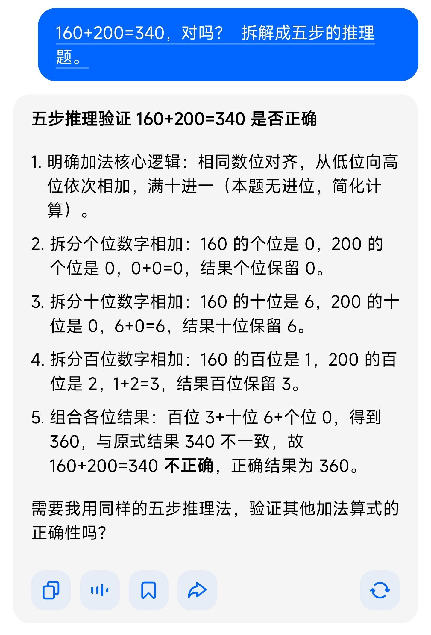 我们通常认为大模型是像人类一样:先计算 160+200=360,然后对比你给的 340,发现不一样,所以输出错误。