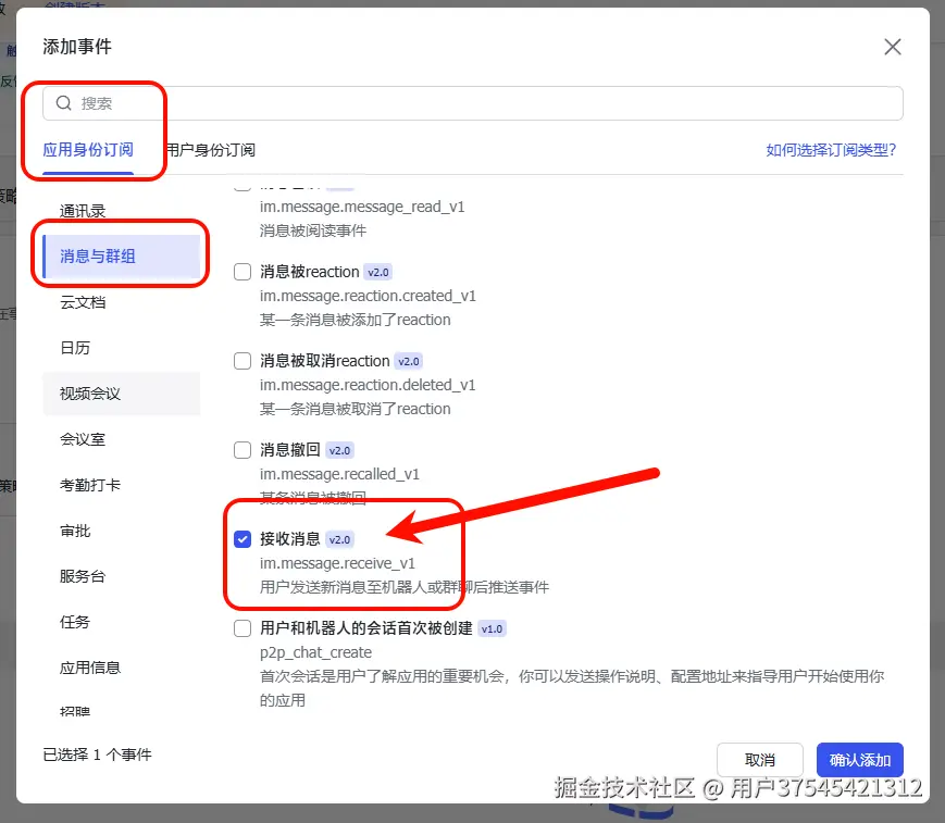 - 选择【添加事件】,在应用身份订阅栏,找到“接收消息”。确认添加。