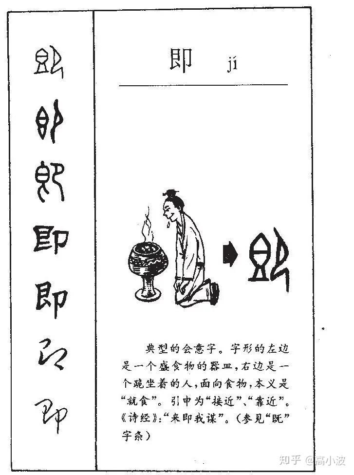 “即”的字形义是“(嘴)凑近饭”的意思,“既”的字形义是“吃饭打嗝”的意思。