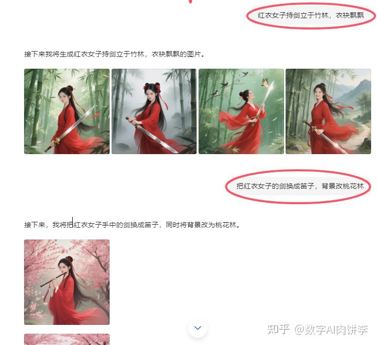再比如写了段古风小说:“红衣女子持剑立于竹林,衣袂飘飘”,生成图片后,接着说“把剑换成笛子,背景改桃花林”,立马呈现吹笛女子在桃花纷飞中的画面,服饰细节、氛围色调无缝衔接。