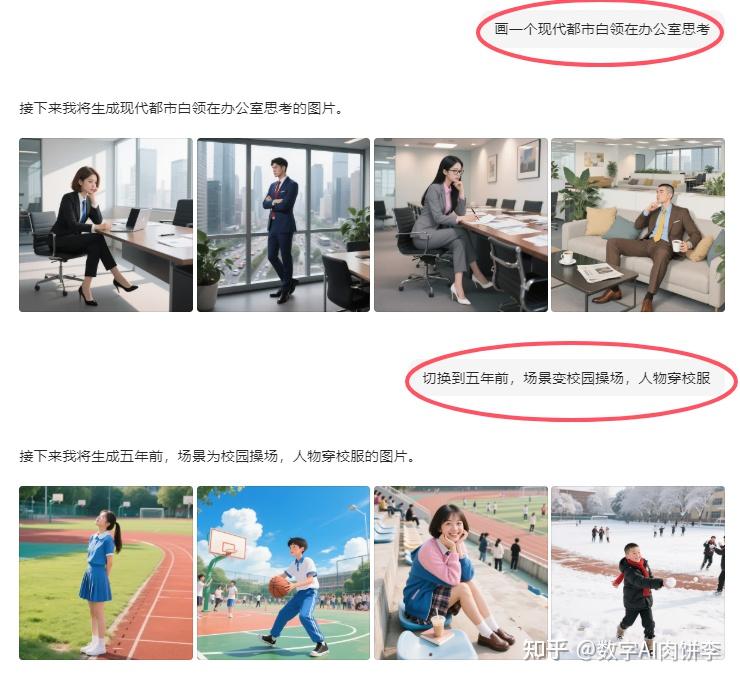 就算是复杂的连续分镜,豆包也能hold住。比如先画一个现代都市白领在办公室思考,接着要求“切换到五年前,场景变校园操场,人物穿校服”,它会精准保留人物特征,同时细腻调整场景元素,从文件报表到课本校服,从格子间到塑胶跑道,过渡自然流畅。