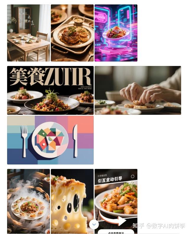 生成3组不同比例的美食图片,每组包含3种风格: