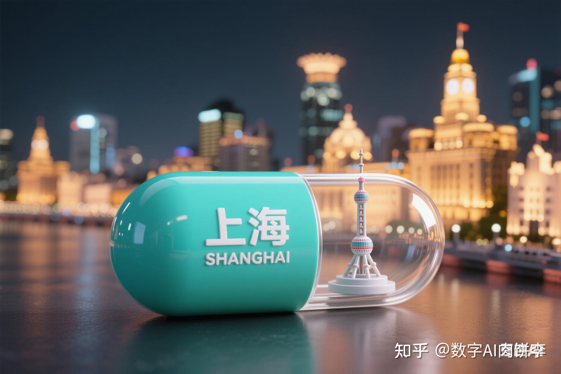 “生成3:2比例图片,胶囊横放,一半选清新薄荷绿,印着白色‘上海’和英文‘SHANGHAI’,另一半透明里藏着东方明珠微缩模型,背景是外滩夜景缩影,3D渲染带梦幻光泽,像精致手办!”