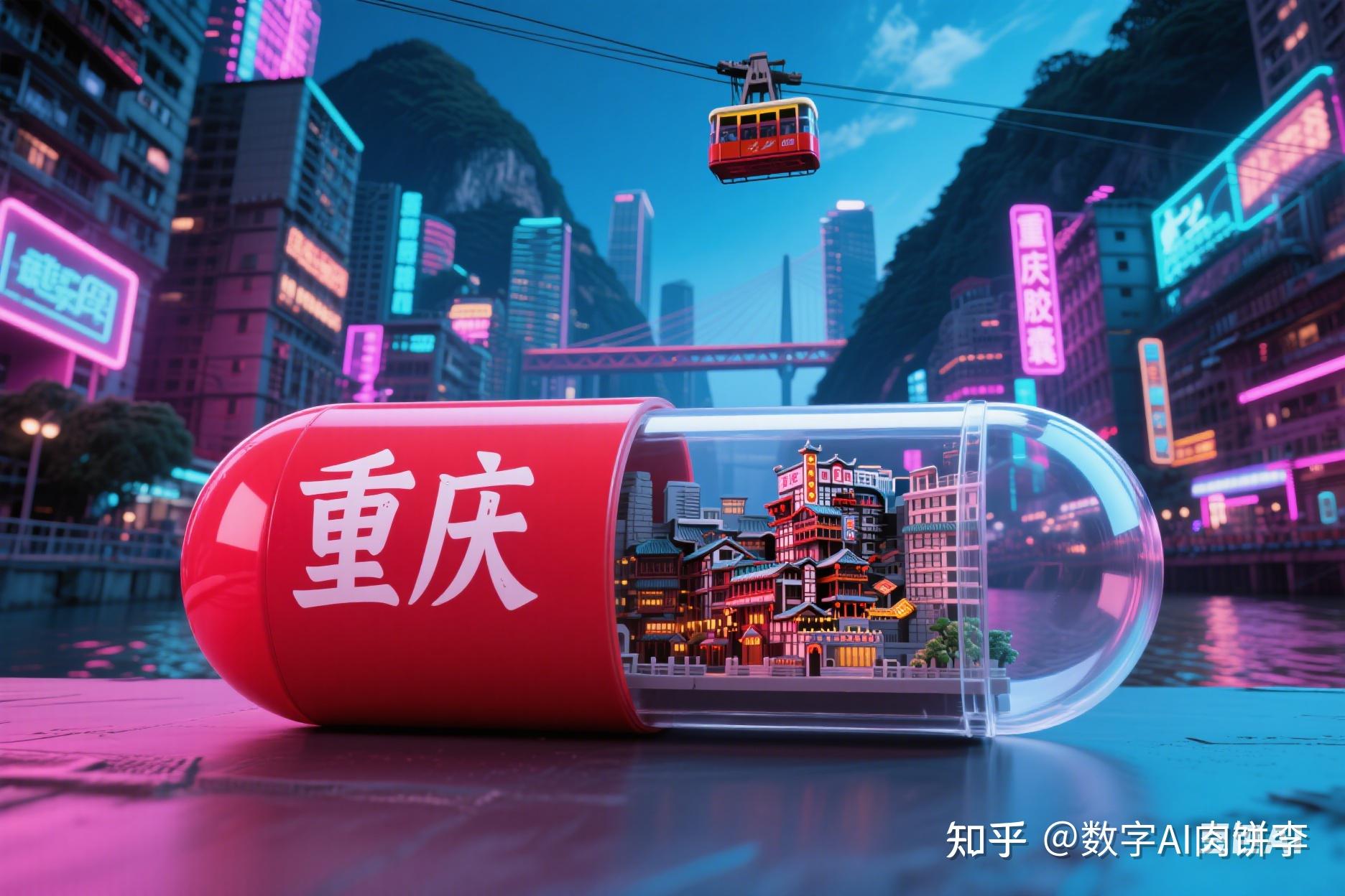但肉饼还是想换成重庆,让它一半胶囊用热情的红色,印着“重庆”二字,另一半透明处装着洪崖洞的微缩模型,背景是错落的山城建筑与长江索道,赛博朋克风拉满,瞬间成为城市宣传大片。