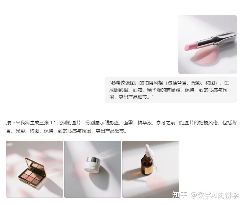 再看化妆品拍摄风格模仿,给张口红图,它能举一反三生成眼影、面霜、精华液的商品照,连背景的干花光影都复刻得一模一样,美妆博主都得狂喜吧!