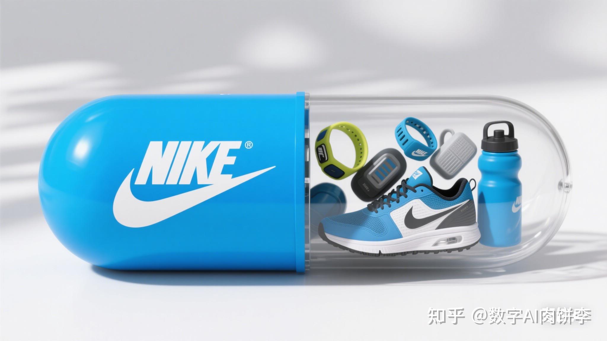 生成 16:9 的胶囊图片,胶囊左半部分为蓝色,印有白色‘NIKE’字样和标志;右半部分透明,内部有运动鞋、运动配件等元素,背景简洁,体现运动活力。