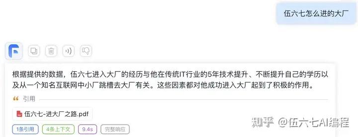 基于这个知识库,我们可以构建这样一个智能体,可以回答任何关于伍六七进大厂的问题。