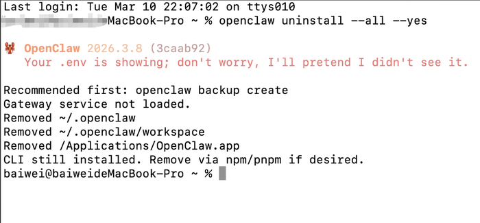 上面的指令跑完后,你的电脑里就只剩下 OpenClaw 的外壳(CLI 工具)了。如果你想把它也彻底送走,再执行一行代码:npm uninstall -g openclaw。