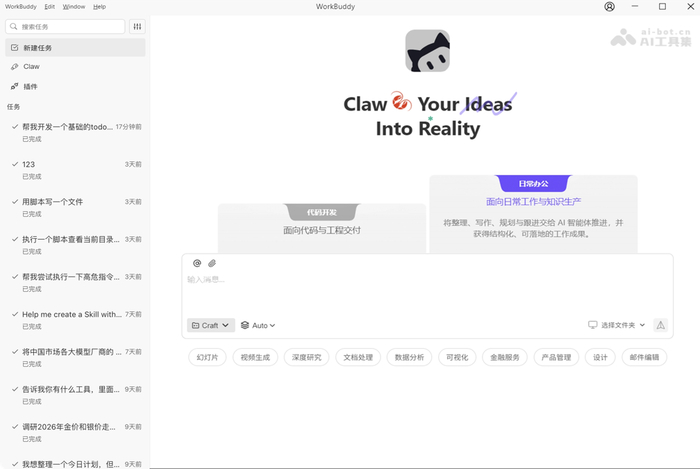 - 智能文档创作:用户只需用一句话描述需求,WorkBuddy 能自动生成工作报告、技术文档、会议纪要、邮件、周报等各类可直接使用的办公文档。