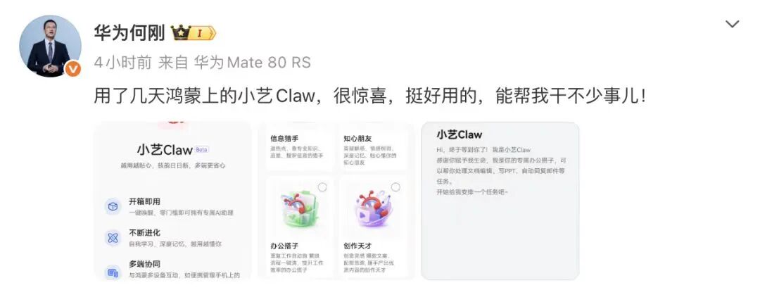 11日,马化腾在朋友圈介绍腾讯“龙虾矩阵”;华为终端BD首席执行官也展示了手机上的“小艺Claw”。图源:澎湃新闻、微博