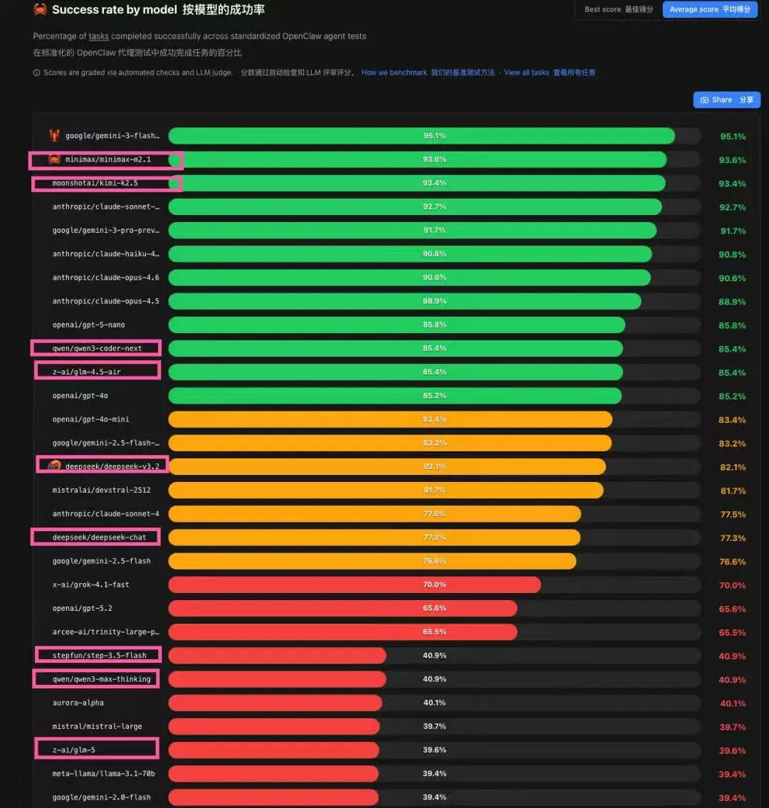 “养虾”大模型排行榜,有框者为中国AI大模型。图源:APPSO