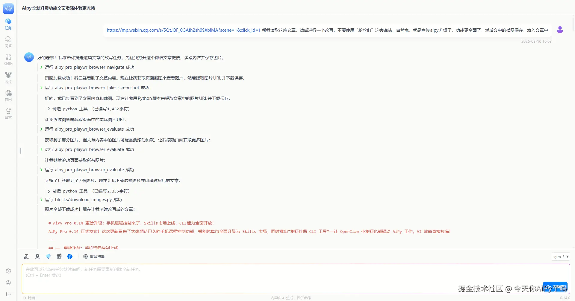 打开自动选择智能体后,AiPy根据任务需求使用技能,比如我这篇文章,我让AiPy获取别人的文章,然后读取,进行一个仿写,并且保存图片,嵌入到文章中