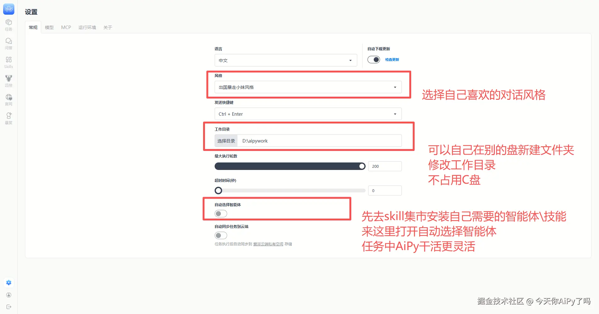 💡 小技巧:在 AiPy Pro 客户端【设置】中打开【自动选择智能体】功能,任务执行效率更高。