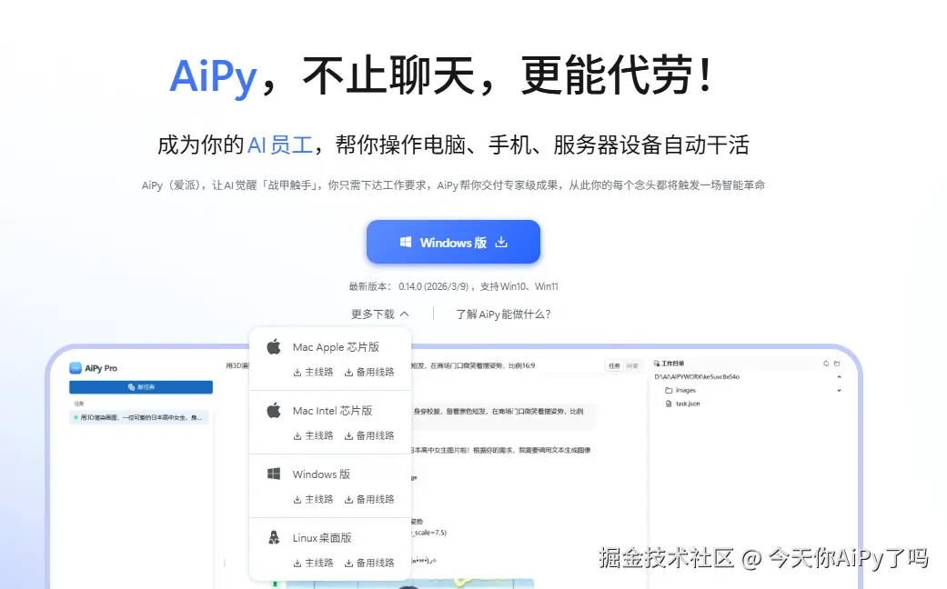 AiPy Pro 0.14 正式发布!这次更新带来了大家期待已久的手机远程控制功能,智能体集市全面升级为Skills 市场,最重磅的是——OpenClaw 智能体一键安装,完全不需要自己配置,点击就能用!