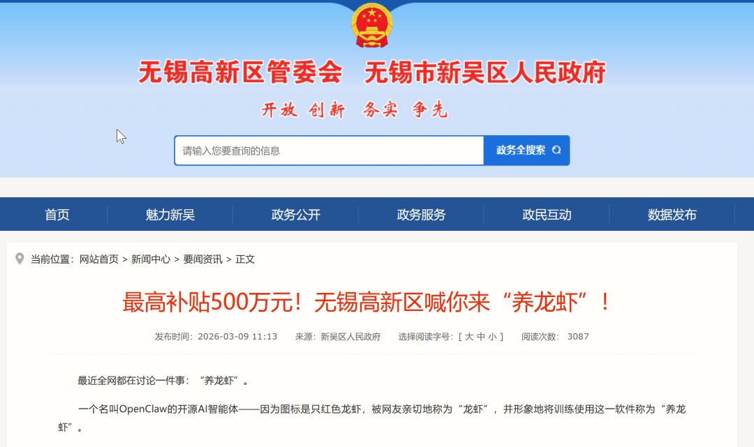 这只“龙虾”究竟有多火?全国人大代表、中国工程院院士高文在两会现场直言:“现在大家急得不得了,生怕没有养上‘龙虾'。”3月6日,腾讯在深圳总部楼下举办免费安装活动,近千名科技爱好者排队参与。深圳龙岗区推出“龙虾十条”,深圳福田区“政务龙虾”正式上岗,无锡高新区发布“养龙虾”12条扶持政策,单项最高补贴500万元。全国政协委员屈庆超指出,AI“龙虾”的爆火并非偶然,以后可能每个人都会养很多垂直类智能体。全国人大代表黄勇更是感叹:“年轻人排队抢的不只是一个工具,更是对智能经济新形态的向往。”