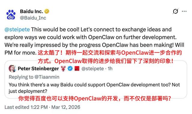 12日11点时许,OpenClaw创始人Peter Steinberger在海外社交平台上连发两条回复,称中国AI创新速度“Amazing”,并表示愿与百度共同开发龙虾。