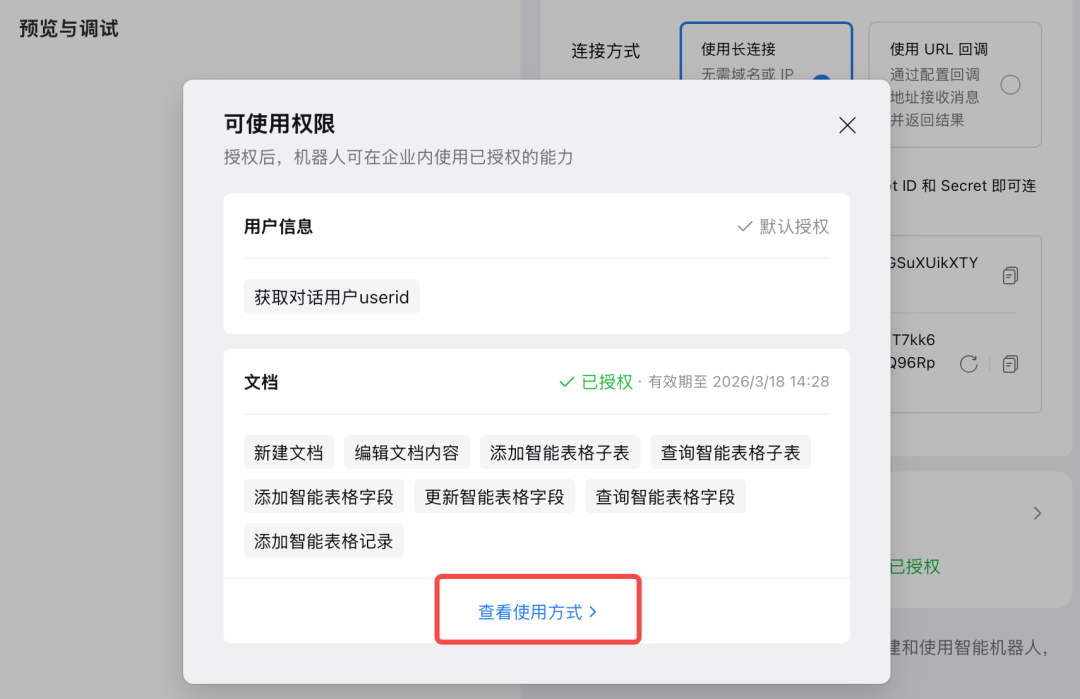 4就在我写这篇文章的时候,企微又推出了一个龙虾写文档的插件,我体验了一下,感觉龙虾的技能又拓展了。安装和使用方法如下:在企微管理后台找到创建的机器人,点编辑,可以看到这个文档授权的界面: