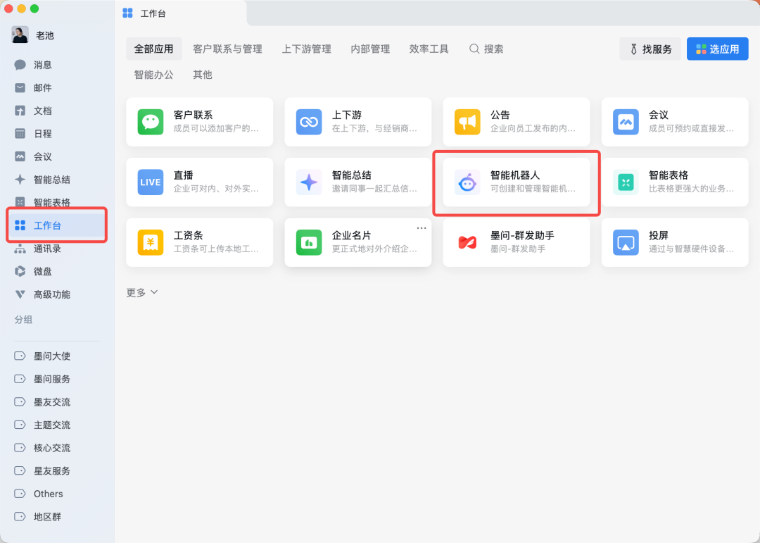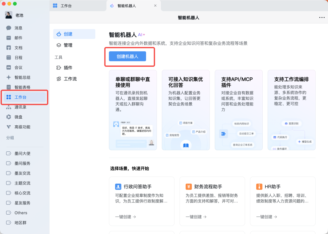 点击连接,安装就算完成了,现在我们就可以通过聊天对话框,和你的龙虾协作了。2如果我们每次和 OpenClaw 交互都必须打开这个控制台,那这个产品是不可能火成这样的。OpenClaw 设计的精妙之处就是,他提供了一整套可配置的工具链,你可以通过频道(Channels)连接各种 IM 工具,通过构建技能(Skills)结合 OpenAPI 连接和操作第三方系统,分析本地文件等等,甚至可以搞出多 Agent,让 AI 持续基于这些工具链为你工作。其中 OpenClaw + IM 工具是最受欢迎的,也是最常用的。不管我们在哪,打开手机上的 IM 工具,就可以和家里的龙虾对话,通过自然语言操作一台或者多台服务器做事情,这本身就很有吸引力。本周企业微信最新上线了基于 OpenClaw 的官方插件,我试了一下,本地安装也很方便。打开企业微信工作台,找到“智能”,然后在页面内点击创建机器人。