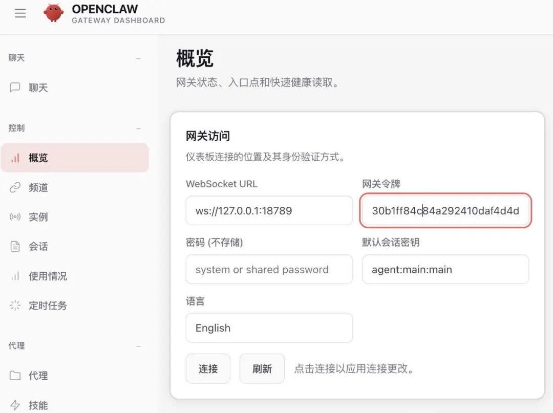 然后启动 gateway,拿到网关令牌: 在终端输入:openclaw gateway找到 token:cat ~/.openclaw/openclaw.json | grep -A5 "token"然后打开 http://127.0.0.1:18789,把网关令牌贴进去: