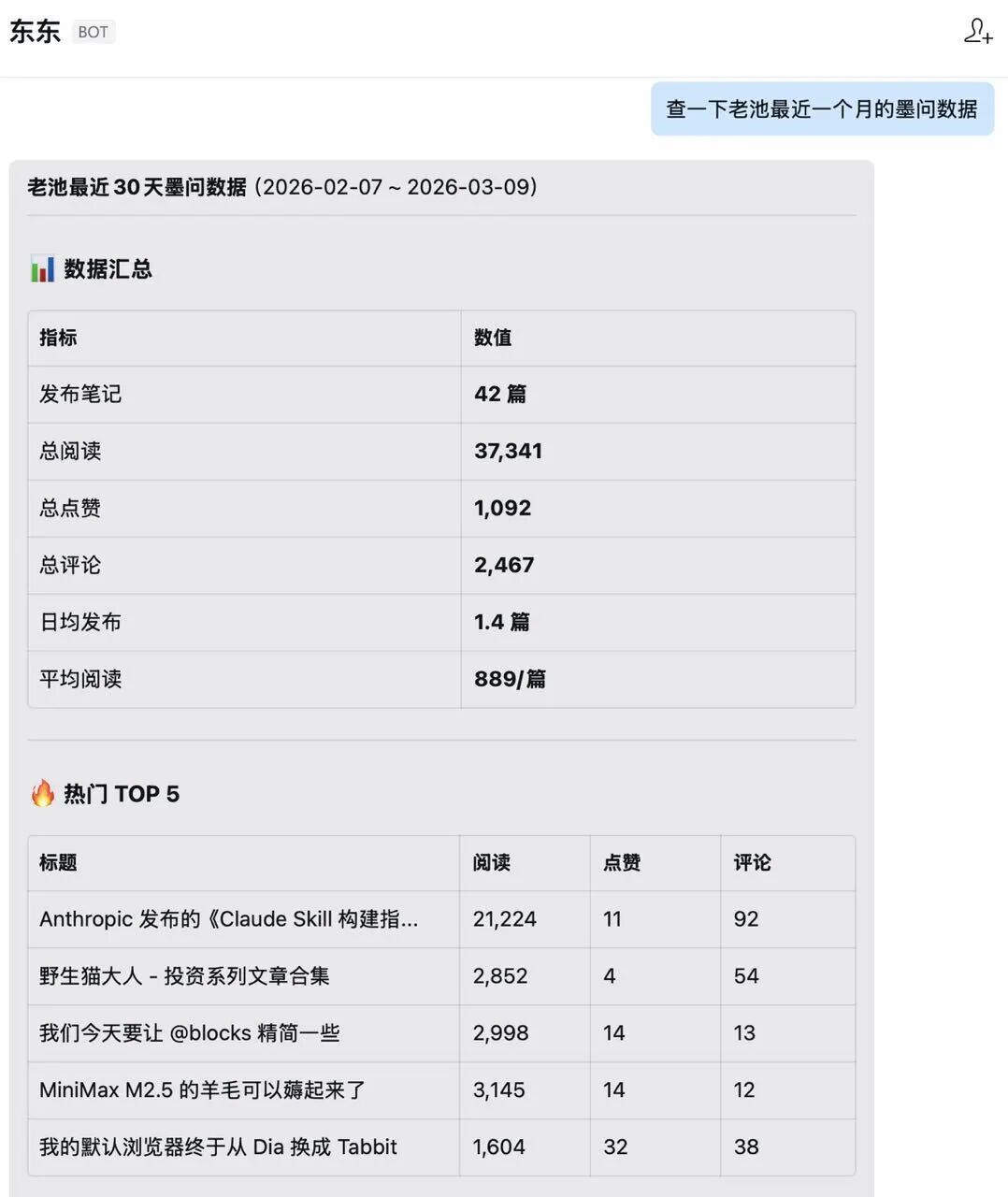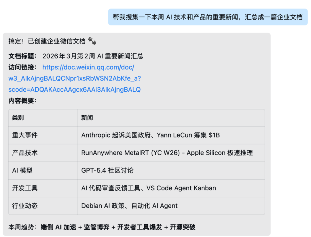 关于企业级的应用场景也挺多了,比如企业知识库、企业微信群里的“执行助手”、多部门多 Agent 应用等等。具体可以参考我昨天写的文章:如果你还不知道龙虾是什么,可以先试试 MaxClaw除此之外,我还基于墨问的 OpenAPI 构建了一些 Skills,现在可以通过企业微信直接发墨问,可以查看墨问用户的创作状态,还能把公司的重要项目,让龙虾跟踪记录起来。对,龙虾还可以协助我写作,收集材料等等。