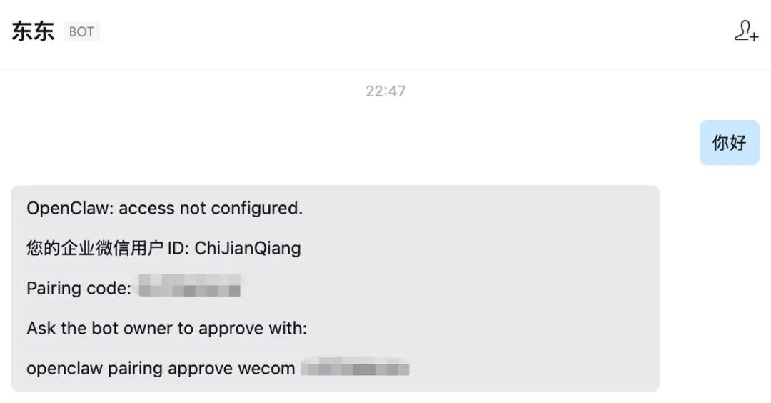 最后一步是配对,打开企业微信,从通讯录里找到“东东”,发送“你好”,“东东”会给你一个 Pairing code,复制下来。