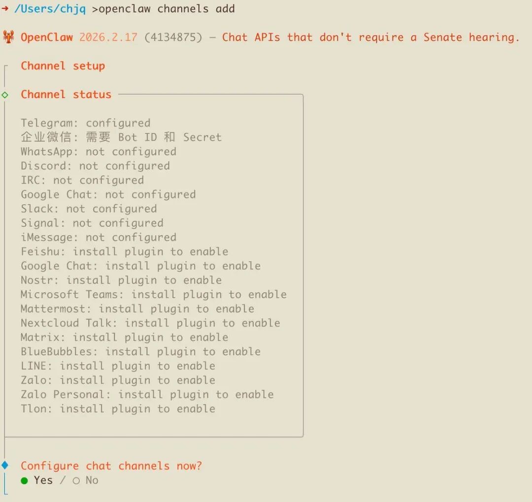 这一步用来安装 Channel 插件。然后执行: