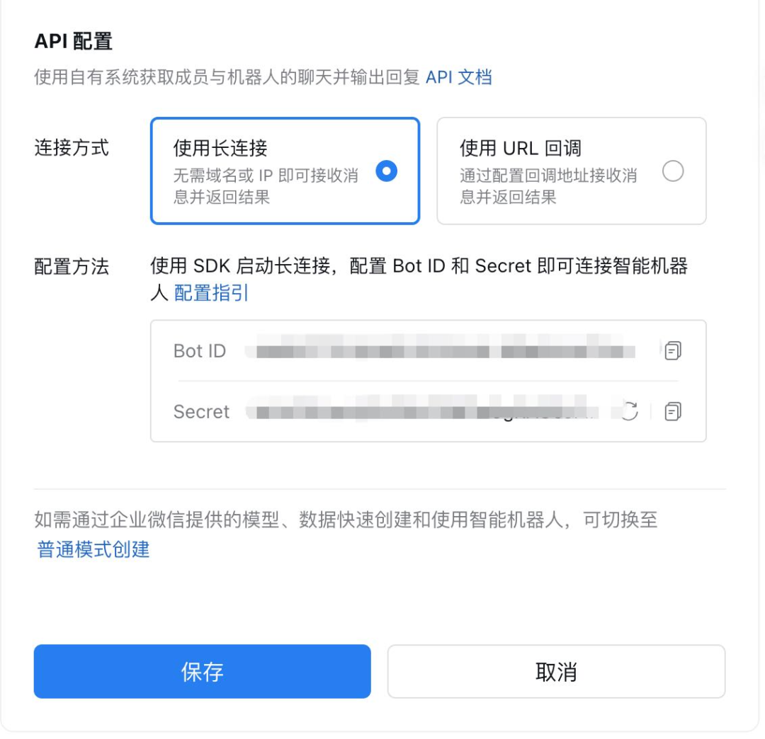 选择企业微信,根据提示输入刚才保存的 Bot ID 和 Secret 即可。