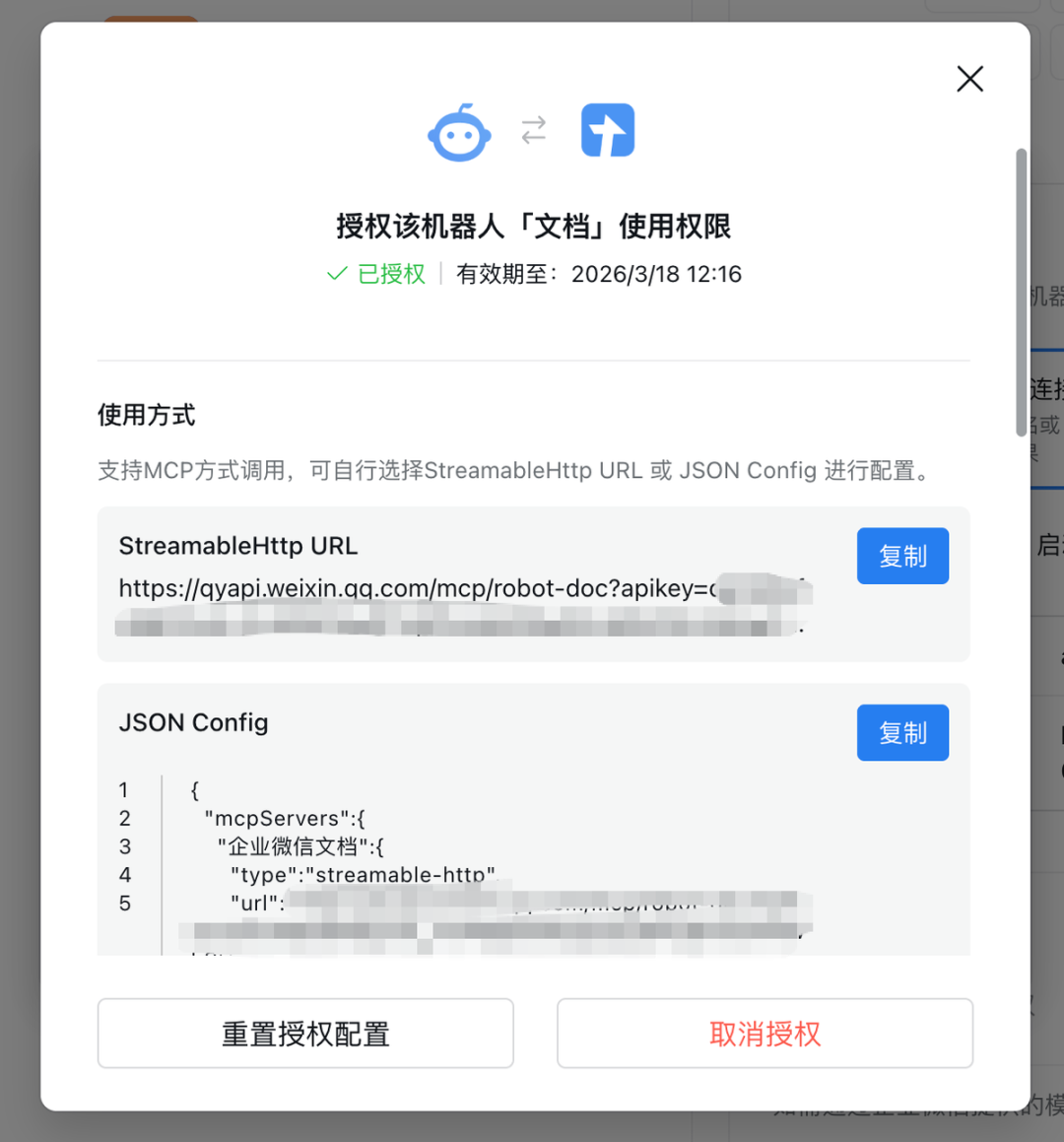 点击授权,点击查看使用方式,会得到一个七天的授权期限和 MCP 调用方式: