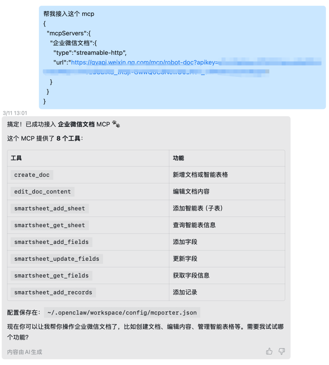 即可安装 mcpporter。执行完之后,把企微后台里的配置信息发送给机器人,就可以完成最终的安装了: