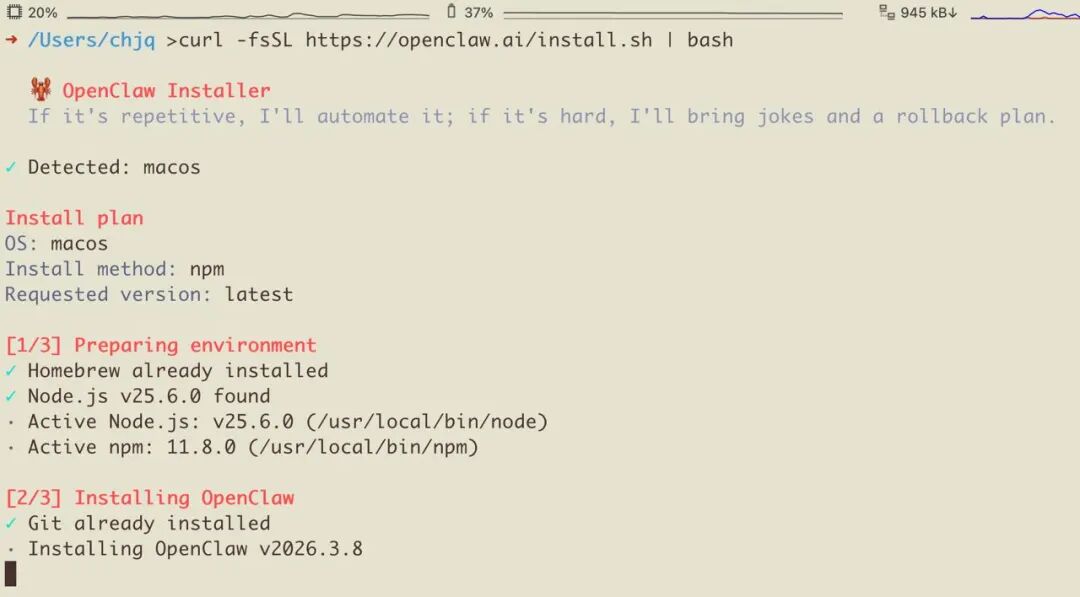 来源:MacTalkOpenClaw 大火之后,据说 Mac mini 卖的非常好,当时我还觉得是媒体炒作呢,后来大师订购了一台 Mac mini,居然需要等俩月,才知道所言非虚。结论就是 AI 爆发,苹果躺赚。大家为啥买 Mac mini 呢?为了在本地安装 OpenClaw。花几千块就可以买一台 M4 芯片的 Mac Mini,往家里或者公司里一扔,7 乘 24 小时开机,macOS 全年无休毫无问题,可谓养虾利器。昨天介绍了云端养虾,那么在本地装 OpenClaw 有什么好处呢?如果你具备足够的技能,对命令行和 macOS 有一定的了解,并且具备探索精神和安全意识,那么在本地部署一套 OpenClaw,可以让你获得更多乐趣。OpenClaw 有系统化的长期记忆机制和自我管理能力,通过统一的 gateway 和本地 Agent、Skill,把模型调用、本地工具、脚本、文件操作,甚至家里的 IoT 设备都可以连接在一起,在一台 Mac mini 给足权限、配好 Skill 之后,它就可以长期驻守,扮演一台 7×24 小时的“超级管家”。1话不多说,咱们直接上手本地安装 OpenClaw。现在的最新版本是 26.3.8,刚刚更新,这个版本把备份、溯源、配置安全和插件开发体验都补强了,记忆能力也更好了,是个值得更新的版本。打开 macOS 的终端执行安装脚本: